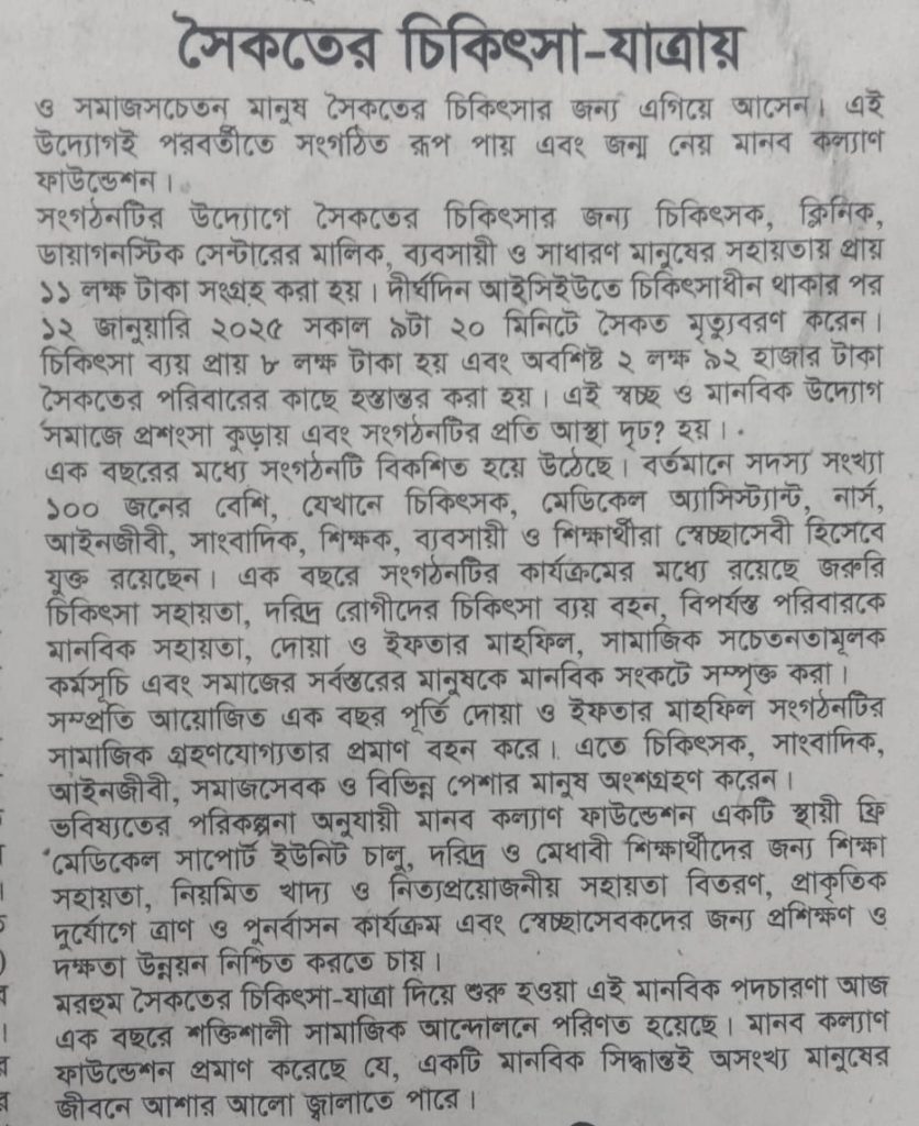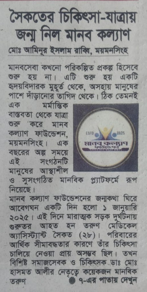 মানব কল্যাণ ফাউন্ডেশন, ময়মনসিংহ এর সূচনা ও অগ্রযাত্রা নিয়ে দৈনিক “বর্তমান বাংলা” য় প্রকাশিত বিশেষ প্রতিবেদন।